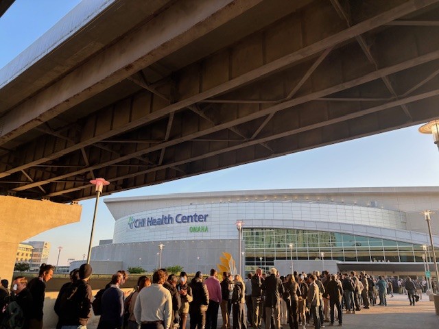 朝7時が入場時間で、私は6時半くらいに到着しましたが、すでに長蛇の列でいかに熱心な株主が多いことがわかります。会社発表によると参加した株主は2万人とのことでした。列に並んでいる間も株主の間で「どこから来たの?」、「今年初めて?」から始まり、金融市場やバフェット氏の話題などやや興奮気味な会話が聞こえました。